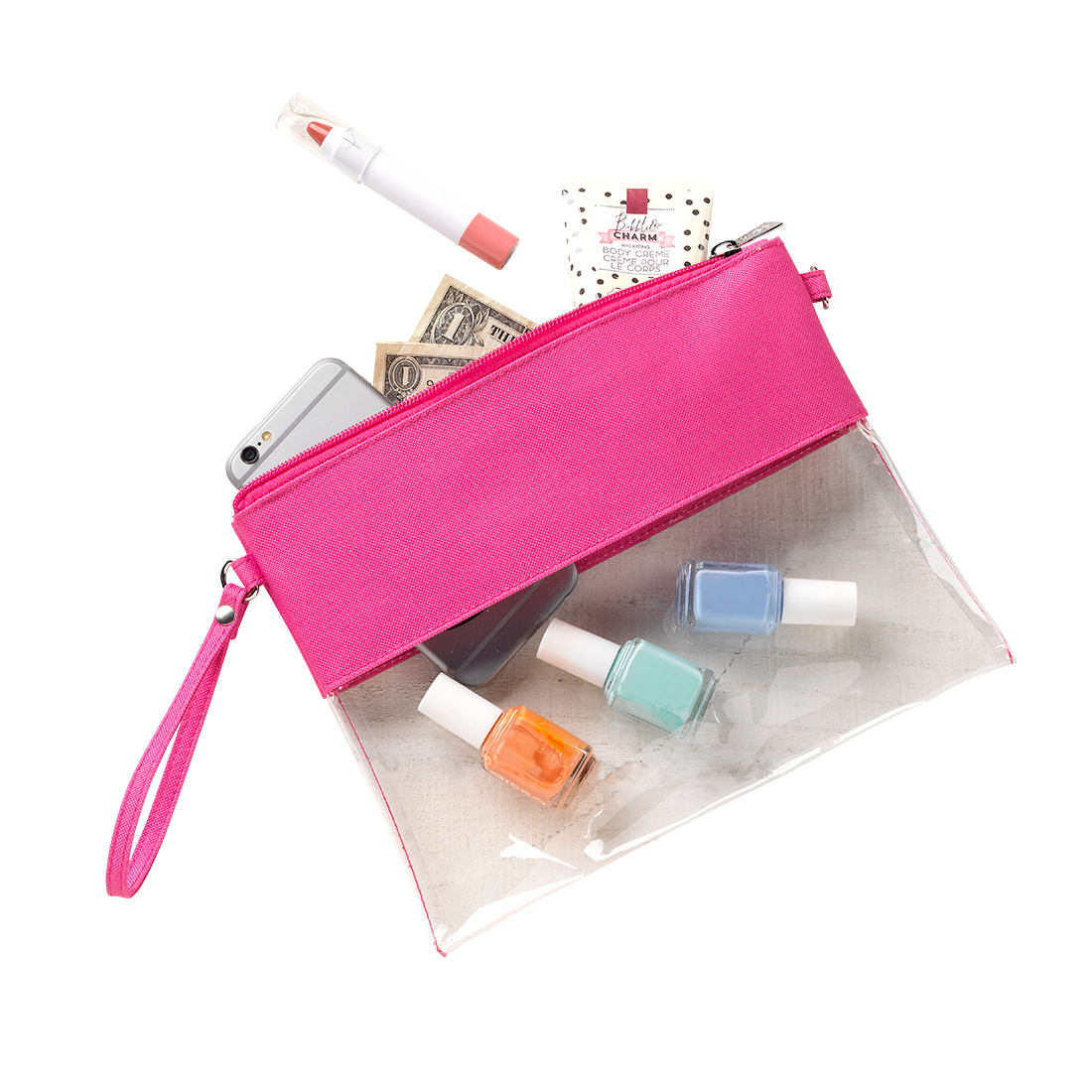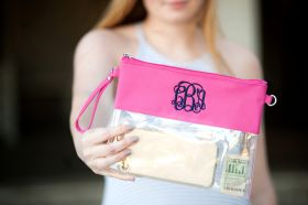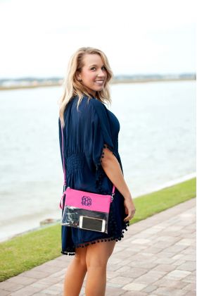 Our clear crossbody doubles as a wristlet and will have you football ready. Personalize your see through purse with a monogram and cheer for your team. This crossbody doubles as a wristlet. Remove the strap for in instant monogrammed clutch.