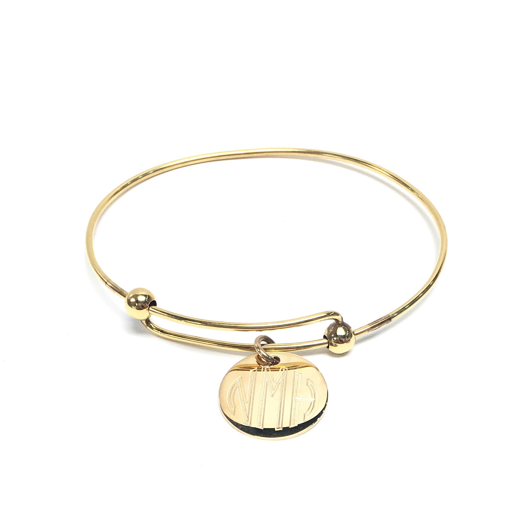 We love these monogram bracelets! With our golden German silver bracelet, featuring an engraved circle charm, you can add personalized style to your jewelry box! This engraved bracelet is personalized with your choice of engraving font and lettering you prefer. Our personalized silver bracelet is shown here engraved with Interlocking font. Our personalized bracelets are perfect for every special lady in your life. Your engraved bangle is made from German silver and features a trendy charm style. The circle charm is 0.8".