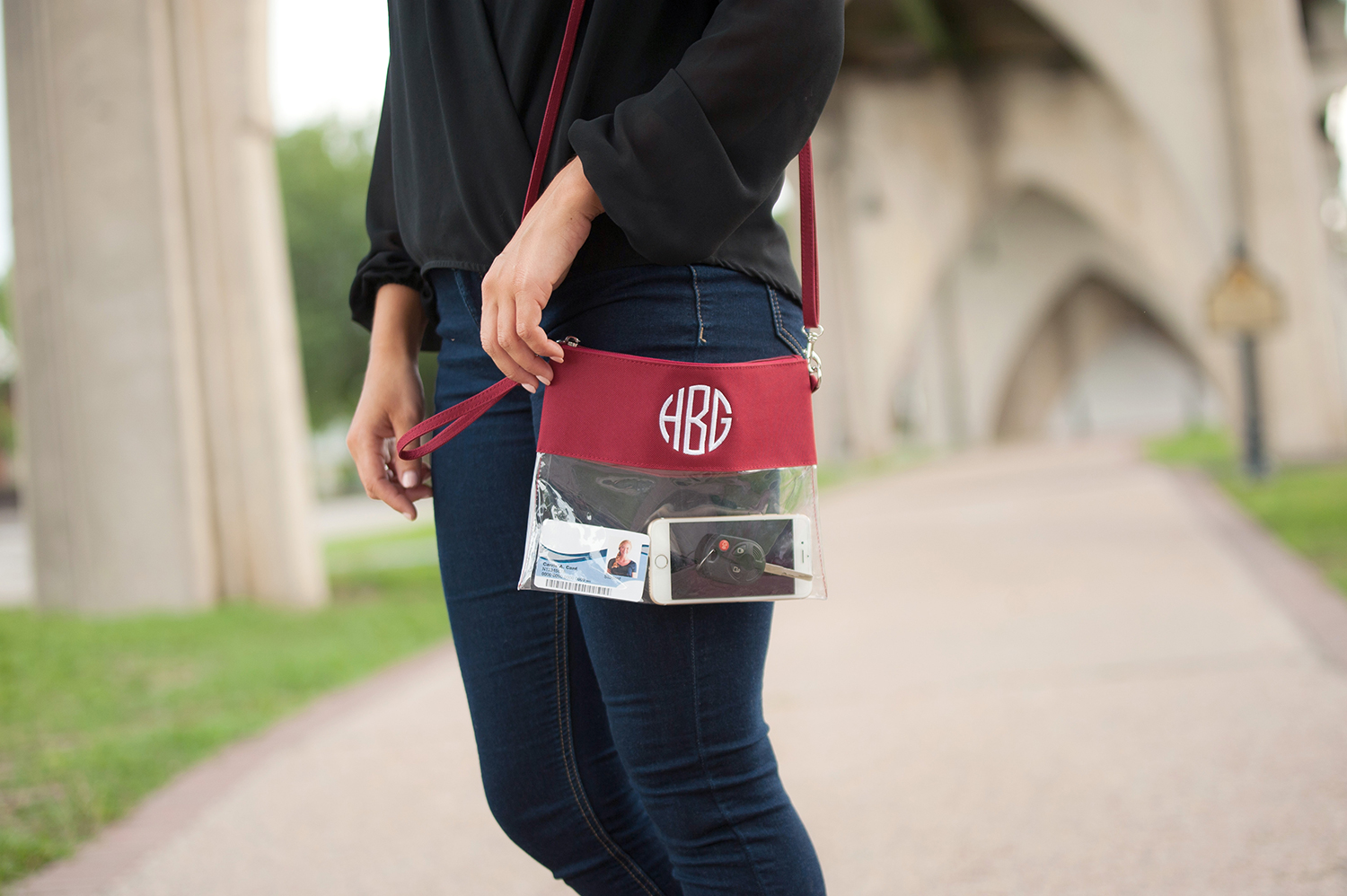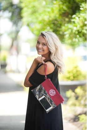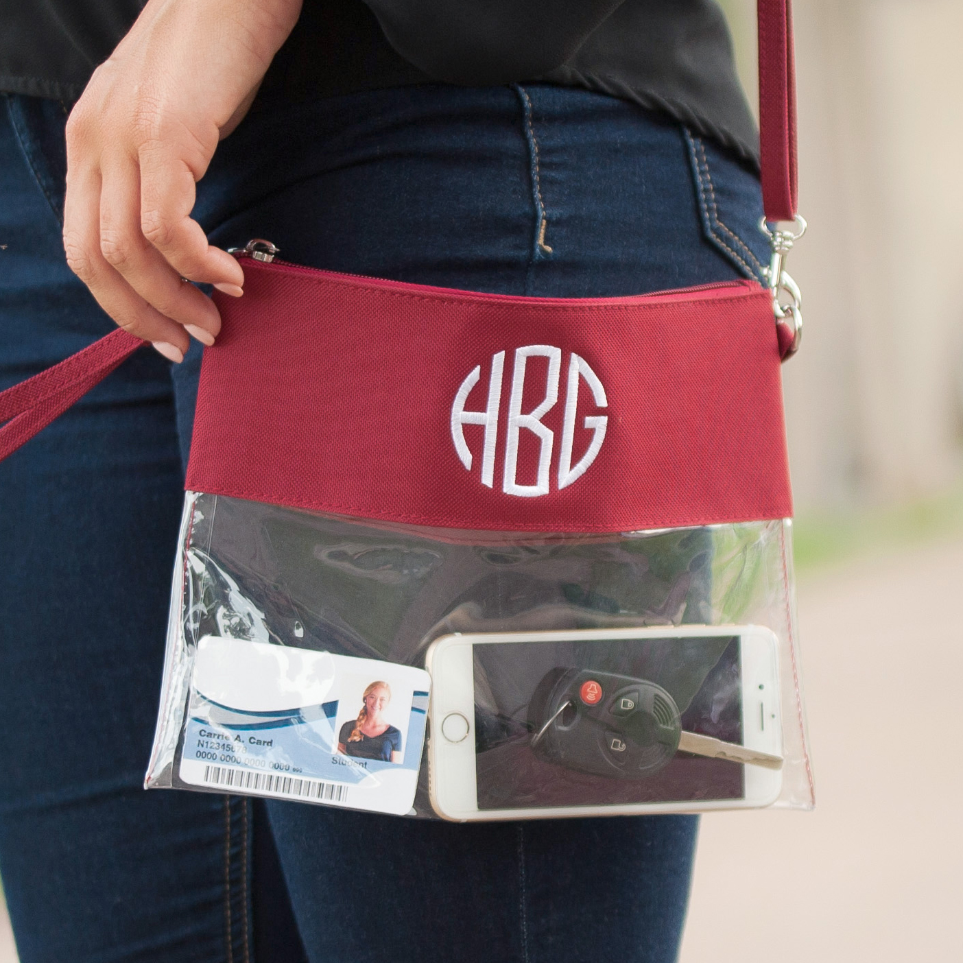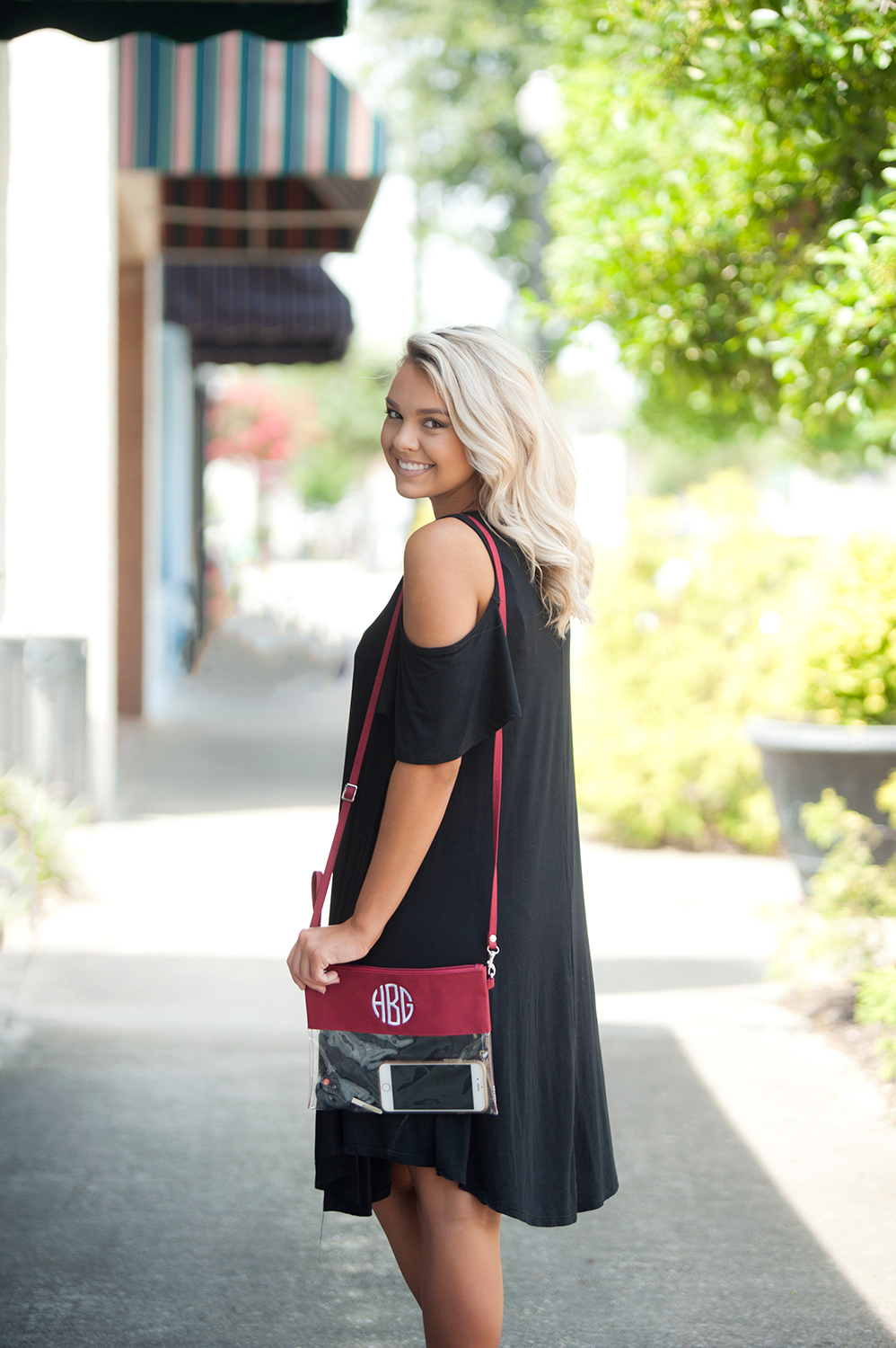 Our clear crossbody bag will have you football ready. Personalize your see through purse with a monogram and cheer for your team. This crossbody doubles as a wristlet. Remove the strap for in instant monogrammed clutch.
