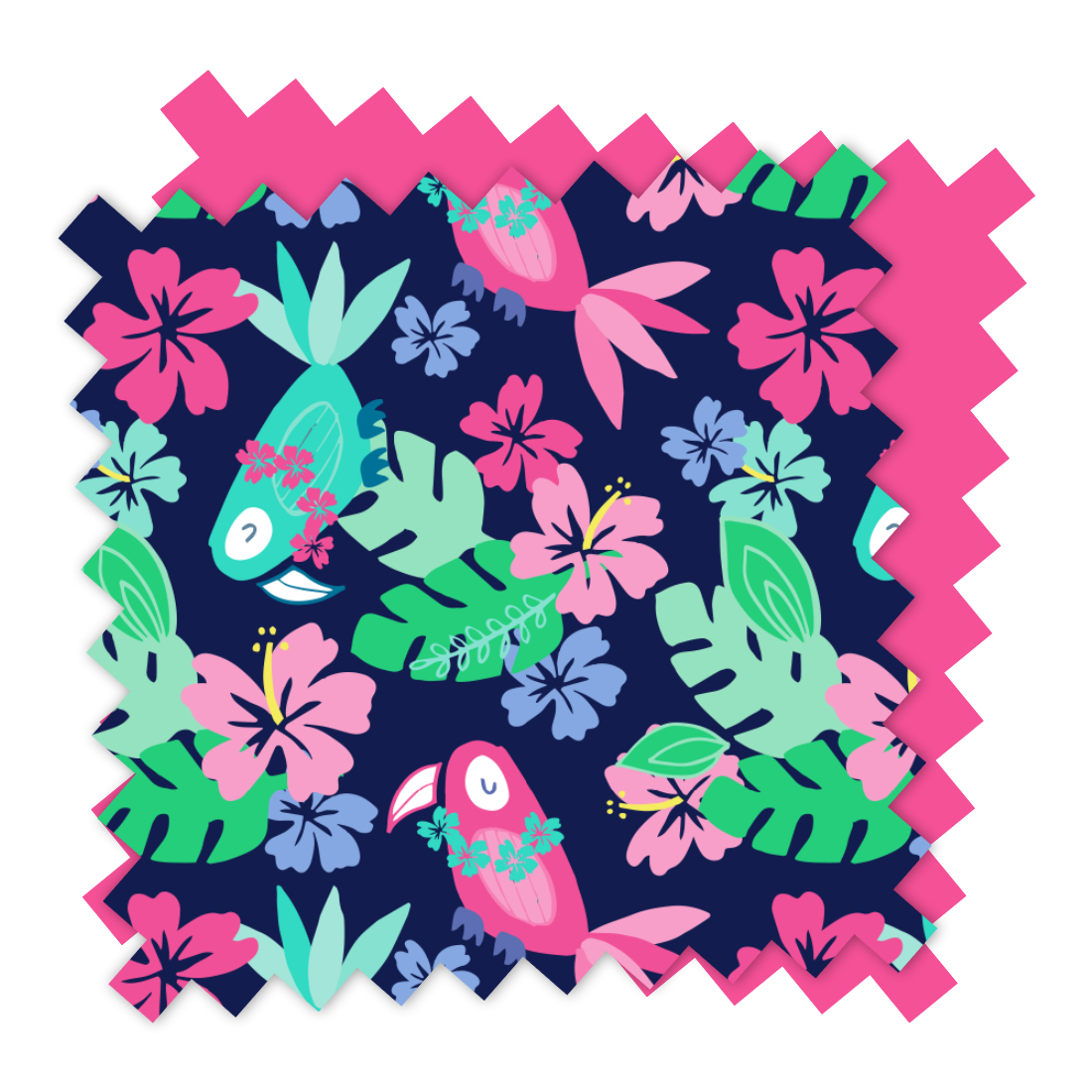 • The Tropi-Cool pattern combines fabulously feathered toucans and island inspired florals to create a truly tropi-cool print. This print is comprised of pinks, greens, mint, blue hydrangea, and navy.