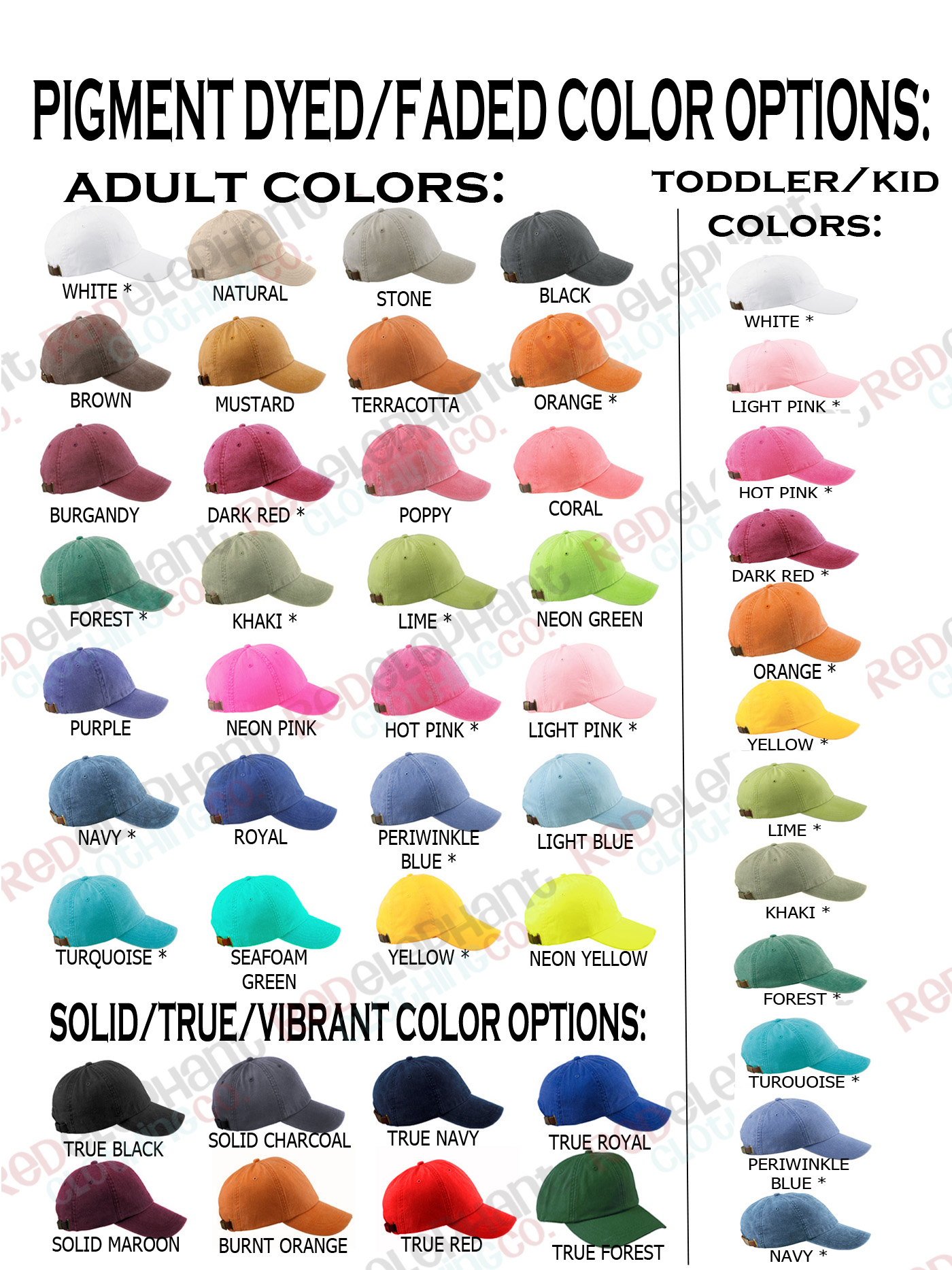 Add personalized style this summer with a monogrammed baseball Hats for kids! These monogrammed hats are made with pigment dyed, garment washed twill for a worn and faded look. Your embroidered baseball hat is fully adjustable around the head. Toddler/Kid caps adjust from approximatly 18" to 24" around the head. Adult caps are adjustable from 22" to approximately 26" around the head. From crown to edge the kid caps are 6" and the adult hats are 6.5".