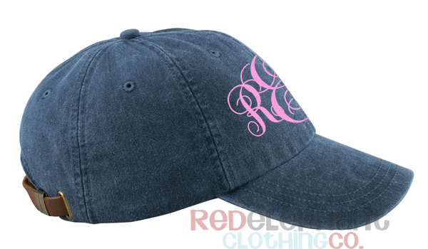We'll embroider you navy baseball hat with a 3 letter monogram in your choice of font and thread color you prefer. Font shown here is bubble gum pink with interlocking font.