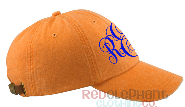 We can embroider your orange baseball hat with a your monogram in your favorite style font and the thread color you prefer. Font shown here is royal and interlocking font.