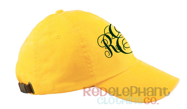 We've embroidered this yellow baseball hat with a 3 letter monogram in whatever style font and thread color you prefer. Font shown here is black interlocking font.