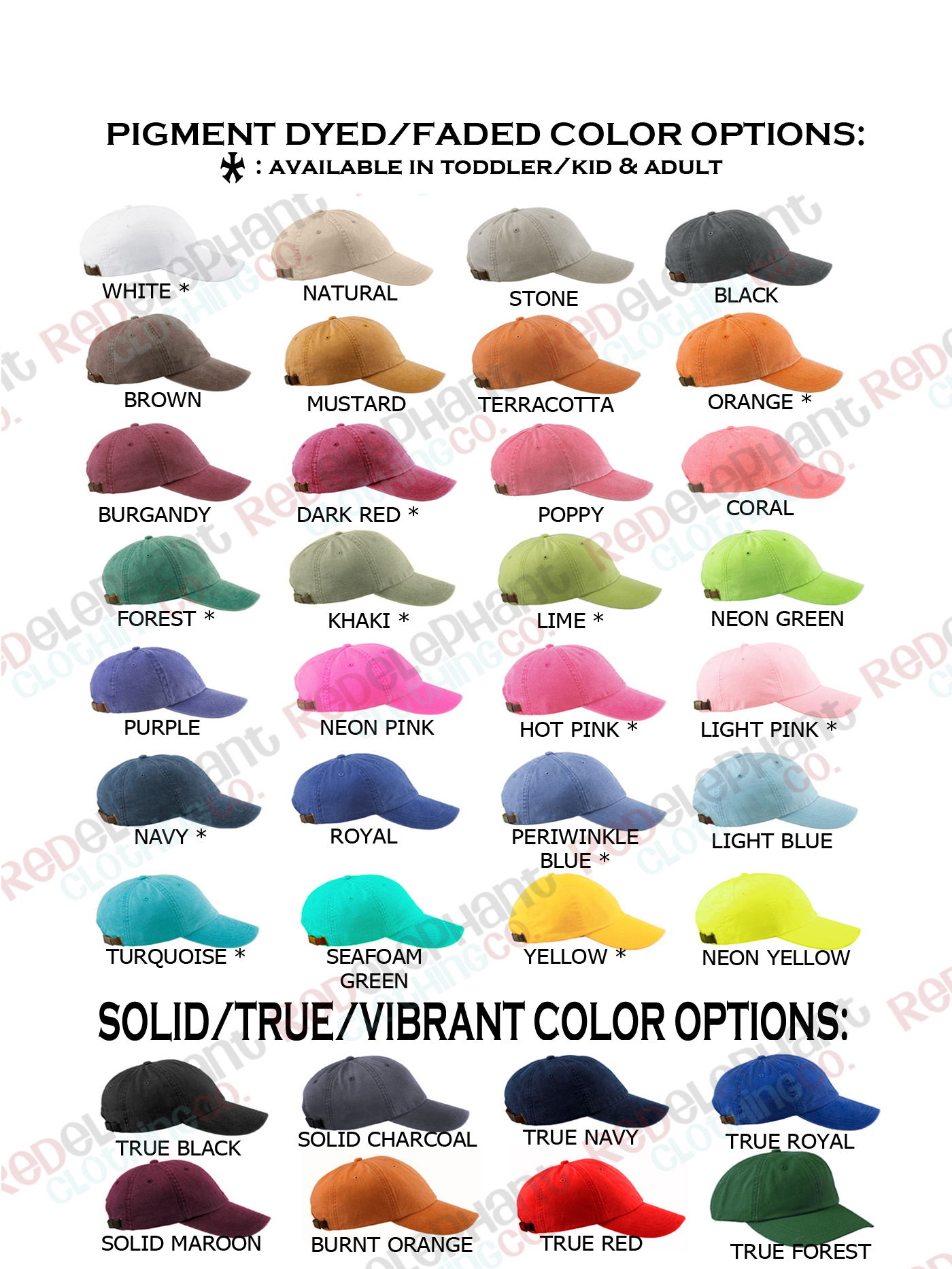Sunny days are ahead in your personalized baseball hats for kids. These monogrammed hats are made with pigment dyed, garment washed twill for a worn and faded look. Your embroidered baseball hat is fully adjustable around the head. Toddler/Kid caps adjust from approximatly 18" to 24" around the head. Adult caps are adjustable from 22" to approximately 26" around the head. From crown to edge the kid caps are 6" and the adult hats are 6.5".