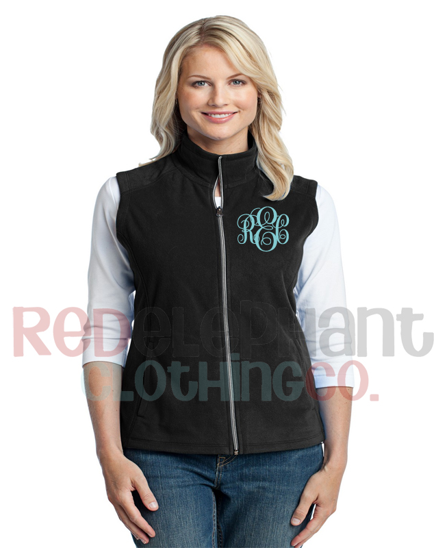 We love these monogrammed fleece vests! With our embroidered fleece vest for ladies, you can add personalized style to your wardrobe! This personalized fleece vest is monogrammed with your choice of thread color in the style font and lettering you prefer. Our monogrammed fleece vests are perfect for crisp weather this fall and winter. Your personalized vest is made from 100% soft spun polyester fleece.