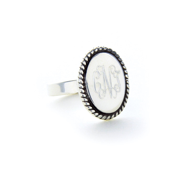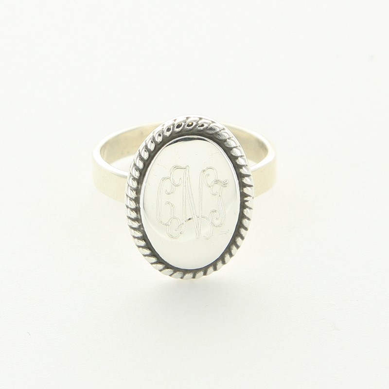 We love these monogrammed rings! With our sterling silver ring, with oval shaped disc for ladies, you can add personalized style to your jewelry box! This engraved silver ring is personalized with your choice of engraving font and lettering you prefer. This sterling silver ring is shown engraved with Interlocking font. Our personalized rings are perfect for every special lady in your life. Your engraved ring is made from sterling silver and features a braided pattern surrounding the oval disc. The disc on this personalized ring measures 0.6" (17 mm) x 0.5" (13 mm).