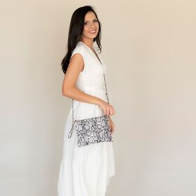 This vegan leather crossbody bag will have you date night ready. Personalize your shoulder bag with your initials and elevate your accessories. This clutch doubles as a wristlet or snap on the removable strap for an instant monogrammed crossbody bag.
